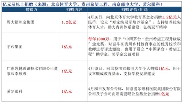 捐赠金额在亿元及以上的共四笔,分别是周大福珠宝集团捐赠1.2亿元,贵州茅台捐赠1亿元,广东领越通讯技术有限公司董事长李顺成捐赠1亿元,爱尔眼科捐赠1亿元。