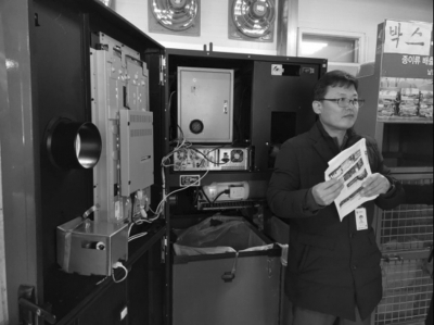 西归浦市政府生活环境课Clean House组长梁根赫展示易拉罐、塑料瓶回收机器内部