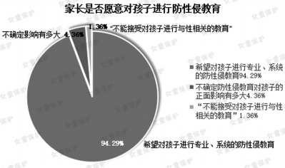 “女童保护”调查显示,94.29%的家长希望对孩子进行专业、系统的防性侵教育,4.36%的家长不确定防性侵教育对孩子的正面影响有多大,仅有1.36%的家长“不能接受对孩子进行与性相关的教育”。
