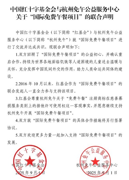 ★中国红十字基金会与杭州免午公益服务中心关于“国际免费午餐项目”的联合声明