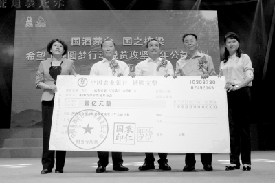 茅台集团董事长袁仁国表示,目前距离实现脱贫目标仅有三年时间,为贯彻落实党中央、国务院的重大部署,积极参与扶贫攻坚战,大力实施精准扶贫,推动实现同步小康,茅台集团与中国青基会制定了“国酒茅台·国之栋梁”希望工程圆梦行动脱贫攻坚三年公益计划。未来三年,茅台集团将每年捐赠1亿元,3年共,开展“国酒茅台·国之栋梁——希望工程圆梦行动”脱贫攻坚三年公益计划。