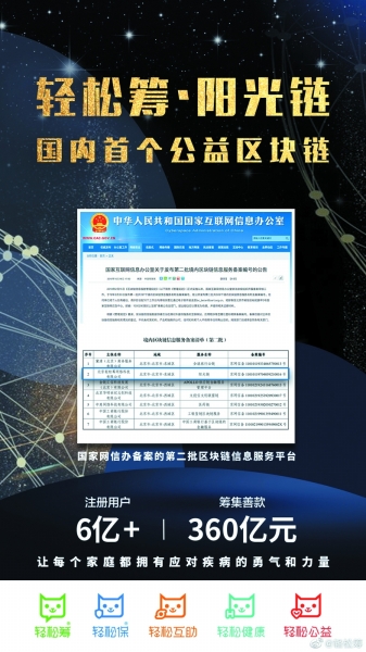 在自主研发的区块链技术的加持下,轻松筹将区块链技术、大数据技术、AI技术等多项科技创新应用在公益事业,联合公益组织、医院以及所有践行公益事业的同行伙伴推出“阳光链”,再一次开创了行业先河。“阳光链”将大病救助、公益机构及互助行动的捐赠记录、资金流向公开透明,为公益事业及大病救助的发展指明了新的方向。