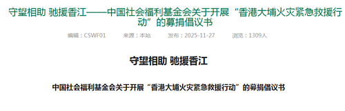针对此次火灾,中国社会福利基金会决定立即启动“香港大埔火灾紧急救援行动”,紧急筹集善款,搭建爱心桥梁,汇聚爱心力量,全力支援香港特区政府做好灾后救助工作,帮助受灾同胞渡过难关。中国社会福利基金会在募捐倡议中表示,将募集善款通过相关机构定向转交至香港特别行政区具备资质的 组织,由其在当地具体落实救助工作,确保救援资金快速、精准抵达受灾同胞手中。