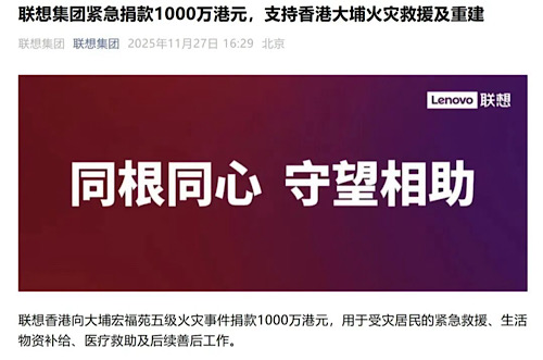 据联想集团微信公众号消息,联想香港向大埔宏福苑五级火灾事件捐款1000万港元,用于受灾居民的紧急救援、生活物资补给、医疗救助及后续善后工作。联想香港已动员集团义工积极参与支持工作,并将与相关部门紧密跟进,探讨以科技方案协助救援及重建工作,与香港市民同心同行,全力救灾。
