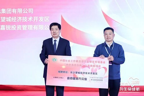 启动仪式上,中国华电集团有限公司宣布向中国社会工作联合会捐赠地贫公益救助款1500万元,长沙市望城经开区捐赠善款130万元,北京日信嘉锐投资公司捐赠善款100万元,重点救助江西省等省(区、市)重症地贫患者。为进一步明确各方责任,合法高效地完成救助项目,中国社会工作联合会公益研究专项基金与江西省卫健委签署了《地贫公益救助协议》,与广州瑞风生物科技有限公司签署了《地中海贫血病公益救助战略合作框架协议》。启动仪式现场为中国华电集团有限公司、湖南长沙望城经济技术开发区、北京日信嘉锐投资管理有限公司、湖南岭孟实业有限公司、辽阳国成热电有限公司、中能润峰伟业实业有限公司、深圳人才谷控股有限公司、北京国电中能电力设备有限公司、安徽利维新型建材有限公司、北京善在量子科技有限公司等十家爱心企业、单位颁发“支持社会工作事业发展社会责任爱心企业”证书。