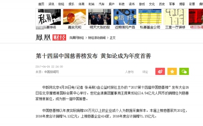 各路媒体的报道,将人们带回到当天的 榜发布盛典现场。来到这里的,有像世纪金源集团董事局主席黄如论这样的知名企业家,他以4.54亿元人民币的捐赠位列 家榜单首位;也有像钢子这样一直默默致力于 事业,至今不愿以真实姓名公诸于世的低调“隐形” 家。