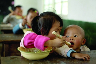 2011年4月27日,免费午餐在湖南新晃县大坪坡村小启动,彭晓雨带着弟弟来了,并给他喂饭