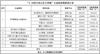 根据 记者统计,截至5月7日17时,针对“3·30凉山森林火灾”英雄募捐,共有7家社会组织(深圳壹基金公益基金会、四川省红十字基金会、北京平澜公益基金会、中国少年儿童文化艺术基金会、中华思源工程扶贫基金会、深圳市建辉 基金会、中国妇女发展基金会)在民政部指定的20家公开募捐信息平台中的7家(腾讯公益、善源公益、水滴公益、轻松公益、阿里巴巴公益、蚂蚁金服、帮帮公益)平台上发起11个募款项目。按已筹款结束和未筹款结束来计算,计划募款额为15750851元,已募款14827320.58元。