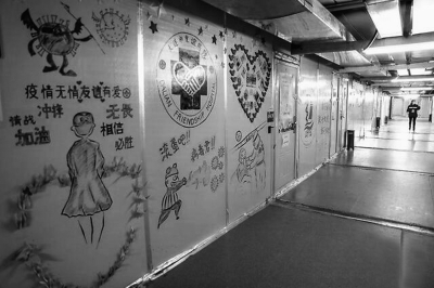4月14日,中新社记者走进武汉雷神山医院,拍摄下病房外走廊墙壁上的一幅幅手绘作品。这些作品多是由各地医疗队医护人员手绘而成,既有抗疫的点滴日常,也有满满的祝福。武汉雷神山医院14日实现患者“清零”。