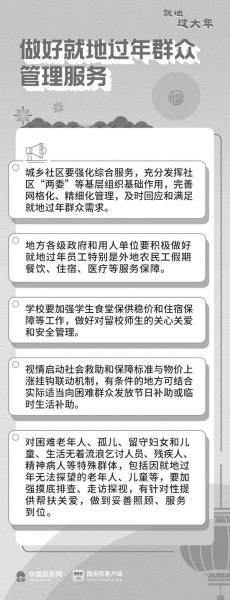 ■ 本报记者 王勇 近日,中共中央办公厅、国务院办公厅印发《关于做好人民群众就地过年服务保障工作的通知》,要求针对因疫情防控需要就地过年群众增加的新情况,抓紧做好各项服务保障工作,让人民群众度过欢乐祥和、健康安全的新春佳节。 为做好相关工作,民政部连续下发了关于做好疫情防控和进一步做好春节期间困难群众基本生活保障以及人民群众就地过年服务保障工作的通知,都明确要求对空巢老人、留守儿童这两类特殊困难群体有针对性的提供帮扶。 为了能够让这些特殊困难群体过一个安全、舒心、祥和的节日,各级民政部门正在当地党委政府统一指挥下,采取了一系列的关爱措施,开展了一系列的关爱行动。 关爱农村留守儿童 日前,民政部下发《关于加强寒假春节期间父母就地过年农村留守儿童关爱服务工作的通知》(以下简称《通知》)。 《通知》要求,乡镇(街道)人民政府、村(居)民委员会要组织儿童督导员、儿童主任切实担起职责、发挥作用,春节前夕对父母双方均就地过年的农村留守儿童情况至少开展1次集中摸底。要切实强化监护责任落实,确保每一名父母就地过年的农村留守儿童都有明确的被委托照护人妥善照料。村(居)民委员会要组织儿童主任详细了解被委托照护人身体状况和监护能力,指导被委托照护人履行照护职责;对因年龄、身体等原因导致不能履行照护职责的,要及时督促父母更换被委托照护人,如因现实困难一时难以更换的,民政部门要第一时间协调落实临时照护职责。 《通知》明确,各级民政部门要将父母就地过年的农村留守儿童作为关爱服务的重点对象,引导务工父母采取电话、视频等方式与留守儿童远程“见面谈心”,切实做到“人在外,爱回家”。对因家庭缺乏通信视频设备或操作不熟练等原因导致不能进行视频的,村(居)民委员会和儿童主任要及时提供帮助。要统筹志愿者、社会工作者等多方力量,为农村留守儿童提供学习辅导、心理疏导等服务,帮助其过好春节、过好寒假。 《通知》指出,各级民政部门要协调将农村留守儿童关爱保护纳入当地联防联控工作机制统一部署,重点给予关心关爱。要结合摸底排查、“政策宣讲进村(居)”等活动,开展疫情防控知识宣传,督促引导被委托照护人加强对儿童疫情防控知识教育,提高防护能力,尽量做到少外出、少访亲、不聚堆。儿童及其家庭在疫情防控物资等方面确有困难的,民政部门、乡镇(街道)人民政府、村(居)民委员会要及时提供相关支持。 《通知》强调,各级民政部门要认真贯彻落实民政部、公安部、卫生健康委等部门《关于做好因突发事件影响造成监护缺失未成年人救助保护工作的意见》要求,加强寒假春节期间监护缺失未成年人救助保护工作。新冠肺炎疫情防控期间,对父母及其他监护人或被委托照护人因确认感染治疗、集中隔离观察,或因防疫抗疫工作需要以及其他疫情影响不能完全履行监护和抚养责任的,民政部门要落实临时照护职责。 《通知》还对寒假春节期间仍对农村留守儿童提供留宿服务照护机构的情况摸排和监管作了部署。 开展关爱行动 除了《通知》要求开展的工作之外,民政部儿童福利司司长郭玉强在1月27日国务院联防联控机制举行的新闻发布会上还表示,为了能够让空巢老人、留守儿童等特殊困难群体过一个安全、舒心、祥和的节日,各级民政部门正在当地党委政府统一指挥下,采取了一系列的关爱措施,开展了一系列的关爱行动。 第一,做好摸底排查。各地在春节前夕进一步对本地的空巢老人、留守儿童情况进行了排查。在已有数据的基础上,进一步摸清这两类群体的详细底数、家庭状况、外出劳力务工情况等。 第二,加强分类帮扶指导。主要做了四个方面的工作: 一是指导村(居)委会加强空巢老人、留守儿童这两类群体的定期探访,特别是发挥村居委会干部、儿童主任、儿童督导员在一线、接地气、熟悉村(居)的工作优势,及时了解需求,反映情况,提供帮助。 二是落实救助保障政策,为受疫情影响的困难老年人提供包括生活照料在内的各种服务。同时,要求各地在疫情防控期间,优化简化事实无人抚养儿童、孤儿和其他困境儿童认定审核审批程序,对于符合条件的,要求做到当月申请、当月审批、当月发放生活保障金。 三是强化家庭监护指导,明确要求外出务工人员要确定一名符合条件的照护人代为照护留守儿童,因现实困难难以明确的,要向村(居)委会进行报告,村(居)委会要指定具有资格的照护人对留守儿童进行照护,确保留守儿童得到妥善的照顾。 四是倡导就地过年外出务工人员采取电话、网络视频等方式,加强与在家的老人和孩子进行沟通联络。 第三,做好疫情防控工作。指导各地进一步把空巢老人、留守儿童这两类特殊困难群体纳入当地联防联控机制工作统一部署,重点给予关心关爱。要求村(居)儿童主任采取适合留守儿童身心特点的方式,加强疫情防控的知识教育,同时在符合当地疫情防控要求的条件下,组织开展一些心理辅导等关爱服务活动。 第四,做好因突发事件导致监护缺失儿童救助保护工作。1月13日,民政部联合发改委、卫健委等九部门下发文件,要求对父母和其他的监护人或者被委托照护人因确认感染治疗、集中医学隔离观察,或因防疫抗疫工作需要等各类突发事件的影响,不能完全履行抚