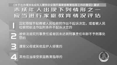 ■ 本报记者 王勇 近日,最高人民检察院、全国妇联、中国关心下一代工作委员会共同印发《关于在办理涉未成年人案件中全面开展家庭教育指导工作的意见》(下称《意见》),大力推动涉案未成年人家庭教育指导工作。 各地要结合已有经验和本地实际,重点推动涉案未成年人家庭教育指导、失管未成年人家庭教育指导、预防性家庭教育指导工作。 “家庭是未成年人健康成长的基础,没有良好的家教家风,未成年人很难养成良好的行为规范。开展涉案未成年人家庭教育指导工作即是当前未成年人保护和犯罪预防工作的现实需要,也是国家对家庭保护的监督和支持。”最高检第九检察厅负责人在就《意见》答记者问时强调。 形势不容乐观 据最高检第九检察厅负责人介绍,近年来,未成年人保护和预防未成年人犯罪工作持续加强、成效明显,但形势依然不容乐观。侵害未成年人犯罪高发多发,性侵害、欺凌、虐待等成为社会痛点和治理难点。未成年人犯罪虽总体数量有所下降,但犯罪低龄化等问题不容忽视。通过对大量个案的分析,我们发现不良家庭环境、不当监护方式是未成年人走上违法犯罪道路或者受到不法侵害的深层次原因。根据检察机关办理未成年人案件情况统计,2020年,流动未成年人犯罪在未成年人犯罪中所占比例超过一半。性侵害未成年人犯罪被害人中,单亲家庭、隔代监护、留守儿童占比超过20%。侵害未成年人犯罪案件中,“隐性”监护缺失问题突出。部分省市办理的涉未成年人案件中,近一半的涉案未成年人未与父母共同生活、脱离家庭监护,近80%的案件存在父母或其他监护人放任、打骂体罚等家庭教育方式不当问题。涉未成年人刑事案件中,监护缺失、监护不当、监护侵害等问题日益突出,成为未成年人保护工作不容忽视的重要问题。 今年6月1日,新修订的未成年人保护法和预防未成年人犯罪法正式实施。“两法”明确规定了监护人及家庭成员的家庭教育职责,强调未成年人的父母或者其他监护人对未成年人的预防犯罪教育负有直接责任,同时,明确公安机关、检察机关、人民法院在办理案件过程中发现实施严重不良行为的未成年人的父母或者其他监护人不依法履行监护职责的,可以责令其接受家庭教育指导。政府应当提供、鼓励、支持家庭教育指导服务。根据党中央的部署要求、未成年人保护的形势需要和法律的明确规定,最高检、全国妇联、关工委决定在办理涉未成年人案件中全面开展家庭教育指导工作。 三项主要任务 《意见》强调,各地要结合已有经验和本地实际,重点推动开展以下工作: 一是涉案未成年人家庭教育指导。对于未成年人出现下列情形之一的,应当对其家庭教育情况进行评估,根据评估结果对未成年人的父母或其他监护人提出改进家庭教育意见,必要时可责令其接受家庭教育指导:1.因犯罪情节轻微被人民检察院作出不起诉决定,或者被人民检察院依法作出附条件不起诉决定的;2.被依法追究刑事责任或者因未达到刑事责任年龄不予刑事处罚的;3.遭受父母或其他监护人侵害的;4.其他应当接受家庭教育指导的。 二是失管未成年人家庭教育指导。对办案中发现未成年人父母或者其他监护人存在监护教育不当或失管失教问题,尚未导致未成年人行为偏差或遭受侵害后果的,应当提供必要的家庭教育指导和帮助。特别是对于有特殊需求的家庭,如离异和重组家庭、父母长期分离家庭、收养家庭、农村留守未成年人家庭、强制戒毒人员家庭、服刑人员家庭、残疾人家庭、曾遭受违法犯罪侵害未成年人的家庭等,更要加强家庭教育指导帮助。未成年人父母或者其他监护人主动提出指导需求的,应予支持。人员力量不能满足需要的,可以帮助链接专业资源提供个性化家庭教育指导服务。 三是预防性家庭教育指导。未成年人违法犯罪多发地区,城市流动人口集中、城乡接合部、农村留守儿童集中等重点地区要结合办案广泛开展预防性家庭教育指导工作。通过家庭教育知识进社区、进家庭等活动,深入开展法治宣传和家庭教育宣传,提高父母及其他监护人的监护意识、监护能力和法治观念,营造民主、和谐、温暖的家庭氛围,预防未成年人违法犯罪和遭受侵害问题发生。各地可灵活运用线上直播、新媒体短视频等多种形式,以案释法,扩大家庭教育宣传的覆盖面。 《意见》明确,家庭教育指导内容包括但不限于以下方面: 1.教育未成年人的父母或者其他监护人培养未成年人法律素养,提高守法意识和自我保护能力; 2.帮助未成年人的父母或者其他监护人强化监护意识,履行家庭教育主体责任; 3.帮助未成年人的父母或者其他监护人培养未成年人良好道德行为习惯,树立正确价值观; 4.教导未成年人的父母或者其他监护人对未成年人采取有效的沟通方式; 5.引导未成年人的父母或者其他监护人改变不当教育方式; 6.指导未成年人的父母或者其他监护人重塑良好家庭关系,营造和谐家庭氛围; 7.协助未成年人的父母或者其他监护人加强对未成年人的心理辅导,促进未成年人健全人格的养成。 构建相关长效工作机制 《意见》强调,为确保在办理涉未成年人案件中开展家庭教育指导工作的质量和效果,各地要积极推动构建相关长效工作机制。 一是建立工作衔接机制。各级检察机关、妇联、关工委要加强协作配合,充分发挥各自职