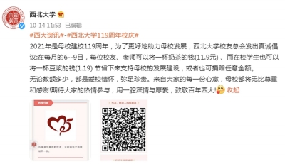 近日,西北大学官方微博发出的一则募捐倡议引发网友热议。 今年,西北大学迎来建校119周年。该校校友总会号召校友、老师及学生,每月捐出一杯奶茶或一杯豆浆的钱,支持母校发展。 倡议发出后,引来网友调侃西北大学是“中国最穷211”。 10月18日,西北大学工作人员回应称,校友捐赠是大学经费的来源之一,很多大学都有这种渠道。“我们是在法律框架下进行的,钱款的使用都会公示。” 募捐“一杯奶茶的钱” 10月14日,西北大学官方微博发布一则捐赠倡议。该校校友总会对校友、老师及在校学生发出号召:在每月的6~9日将一杯奶茶(11.9元)或一杯豆浆(1.19元)的钱节省下来支持母校发展建设,或者也可捐赠任意金额,并在文字下方配有捐赠二维码图片。 倡议发出后,引来不少围观。对此,有网友表示“大为震惊”,并写道“不是说缺一杯奶茶钱豆浆钱……倡议捐钱是长久之计吗”。也有人认为,“虽然我也捐了,希望学校也越来越好,但是我觉得这个行为多多少少有点……” 其中也不乏网友调侃,“捐了,不要让我没学上”“俺们是真的朴”“中国最穷211,心酸,泪目”。 多的留言则是为西北大学“哭穷”:“在校到毕业,感觉西大一直挺大方。这次虽说是倡议,但这样伸手,看来真的缺钱了吧,救救西大”“太惨了太惨了……” 撞名美国著名的西北大学,我国西北大学尽管实力不凡,却显得“不太知名”。实际上,拥有119年历史的西北大学是我国西北地区办学历史最为悠久的高等学府。 官方简介显示,西北大学现为首批国家“世界一流学科建设高校”、国家“211工程”建设院校、教育部与陕西省共建高校。 在2017年的第四轮学科评估中,该校有2个学科进入A类,16个学科进入前30%,学科整体实力和水平较第三轮学科评估有了较大提升。地球科学、材料科学、化学、工程学、临床医学、药理学与毒理学等学科还进入ESI全球前1%行列。 中国“最穷”211? 由校友总会发起的一项募捐活动也许不代表西北大学校方试图以这种方式获得“大力支持”。但这并不妨碍网友们“借题发挥”,为西北大学“实惨”的经费现状而卖力“哭穷”。 当前,陕西省共有8所“双一流”高校,其中3所“一流大学建设高校”,即西安交通大学、西北工业大学、西北农林科技大学;5所“一流学科建设高校”,即西北大学、西安电子科技大学、长安大学、陕西师范大学、第四军医大学。 西北大学则是8所中唯一一所省属高校,这成为影响其经费来源的重要因素。 同在陕西的教育部直属高校西交大、工信部直属高校西工大的2021年经费预算已跻身百亿。其他4所陕西部属“双一流”——西电、西农、长大、陕师大的预算总经费分别为51.78亿元、45.55亿元、35.71亿元、31.87亿元。 作为陕西省属高校,西北大学的预算经费为14.18亿元,和上面几所高校相去甚远。而这一数字已相较去年增加了5.73亿,增长百分比高达67.8%。 在东西部之间、西部区域省份内的高校经费差距更加明显。 2021年,同样位于西部的四川省10所地方高校预算收入均超过10亿元。再以省属头部高校为例,苏州大学预算收入32.84亿元,成都大学为24.3亿元。 经费捉襟见肘,西北大学产出却不低。 据西北大学校长郭立宏透露,该校投入产出比位居全国高校前列。西北大学办学经费投入位列95所一流学科建设高校中下游,高层次人才引育成效和科研产出则分列第8和第24位。 西北大学官微在一篇题为《西北大学2020年十大新闻》的文章披露,2020年,该校获批国家级哲学社会科学科研项目41项,其中重大重点项目8项;教育部人文社科项目20项;获批国家自然科学基金135项,其中重大重点项目6项,获批国家重点研发计划课题8项;科研到款经费3.58亿元,其中理工类纵向项目到款2.26亿元,创历史新高。 2021年8月,西北大学公布2021年度国家自然科学基金项目申请结果。在申报的各类项目579项,共有144项项目获得资助,获批直接经费6944万元,项目资助率24.87%,超过基金委平均资助率8个百分点。获批项目数较上年同期增长9.92%。 高校校友“高额”捐赠 那么,西北大学校友总会发出的募捐是否真的显“寒酸”? 其实,我国其他高校校友会也曾发出类似的倡议,数额也并不高。 比如,北京大学校友会今年7月对该校2021届毕业生发起的倡议以支持北大的一项公益种子计划,倡议捐赠额从1.23元起、或捐赠123元,可获得相应捐赠纪念品。 复旦大学则会在每年建校周年纪念日发起年度捐赠。以2021年为例,复旦建校116年,该校校友会倡导以116元的倍数进行(116,232,348……以此类推),所有捐赠将注入复旦大学校友基金,以支持复旦大学发展。 西北大学校友总会发起的小额募捐倡议之所以引发关注,还源于公众对高校获“高额”捐赠的期待之间的“巨大落差”。 每逢各大高校校庆之时,有关各校校友大手笔捐赠的报道层出不穷。 仅在近段时间就有如下报道: 10月16日,在南开大学建校102周年、南开化学学科创建100周年之际,南开大学化学系校友赵国锋、阚颖、郑保富共同支持1.6亿元,发起设立南开大学化学学科发展基金。 同日,湖北大学举行建校90周年高质量发展大会,广大师生校友及社会爱心人士纷纷向学校捐资助学,截至目前共签订70余个捐赠项目,签约捐赠总金额已超过1亿元。 10月13日,华东师范大学迎来建校七十周年华诞之际,紫江集团捐资1亿元,设立专项建设基金。 9月底,在四川大学