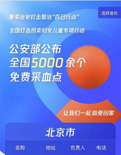 为深入推进打击拐卖妇女儿童犯罪专项行动,充分运用科技力量打拐寻亲,公安部近日公布全国5000余个免费采血点信息,进一步便利广大群众及时就近采血,助力被拐家庭早日实现团圆。 近年来,公安部会同有关部门依法严厉打击拐卖犯罪,累计设置3000余个免费采血点,并向社会公布地址、联系电话,为协助案件侦办、帮助群众寻亲发挥了积极作用,帮助一大批离散家庭实现了团圆。今年3月,公安部会同民政部、国家卫健委、全国妇联部署在全国组织开展新一轮打击拐卖妇女儿童犯罪专项行动。公安部在此前公布免费采血点基础上,通过梳理汇总、集中资源,将免费采血点数量增至5000余个,并通过多种平台集中发布相关信息,进一步扩大免费采血点覆盖面。 公安部有关负责人表示,免费采血工作不受户籍地域限制,请尚未采血的被拐妇女儿童父母、疑似被拐及身份不明人员,尽快到采血点接受免费采血。希望社会各界和广大群众支持参与打拐工作,积极转发扩散5000余个免费采血点信息,帮助更多离散家庭早日实现团圆。 据了解,公安部新媒体平台、公安部刑侦局微信公众号和官方微博、公安部儿童失踪信息紧急发布平台已集中发布5000余个免费采血点信息,可及时查询全国采血点情况。同时,支付宝、微信、QQ已设置寻亲便捷搜索,有采血需求人员可在上述平台搜索栏中输入“寻亲”,即可在搜索结果中查看最近的公安机关免费采血点地址和民警联系电话。(据新华社) |