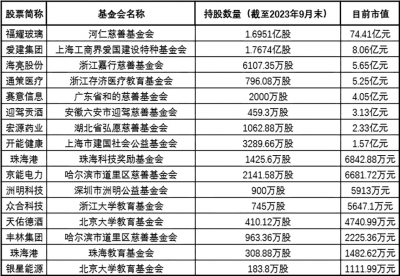 中科创达3月13日晚披露,公司控股股东赵鸿飞拟向北京理工大学教育基金会(以下简称“北理工教育基金会”)捐赠其间接持有的公司16.9万股股份。以中科创达当前股价估算,上述捐赠的股份市值约1041.38万元。如此大手笔的捐赠也引发了市场热议。 作为在民政部正式登记注册的 组织,北理工教育基金会承诺其受赠资金都将用于北京理工大学的教育发展及社会公益事业。 记者根据A股上市公司过往定期报告梳理发现,目前有十几家基金会活跃其中。截至目前,这些基金会合计持股市值已超百亿元,其持股主要来自于上市公司股东捐赠。 截至2023年9月30日,河仁 基金会持有福耀玻璃股票1.7亿股;截至今年3月13日收盘,上述股份市值高达74.41亿元。 河仁基金会由企业家、福耀玻璃董事长曹德旺捐资创立,是全国第一也是唯一经由国务院审批、以金融资产(股票)创办的全国性非公募基金会。基金会的名称,来自曹德旺的父亲曹河仁,名称中蕴藏“上善若水,厚德载物”之意。 2011年5月,在河仁基金会成立大会上,曹德旺与其妻子陈凤英宣布向基金会捐赠个人所持福耀玻璃3亿股股票。上述股票过户当日市值为35.49亿元。 2012年度,河仁基金会减持福耀玻璃股票1000万股,期末持股2.9亿股。在此后的多年时间里,河仁基金会所持福耀玻璃股票一直未发生变化。2020年度,河仁基金会减持福耀玻璃股票6891.09万股,期末持股2.21亿股。2021年、2022年河仁基金会分别减持3180.02万股、1977.6万股,持股降至1.7亿股。 曹德旺一直热衷 。据公开信息,从1983年第一次捐款至今,曹德旺累计个人捐款达160亿元。 持股市值排名第二的 基金会为上海工商界爱国建设特种基金会(以下简称“爱建基金会”)。爱建基金会持有爱建集团股票1.77亿股,市值约8.06亿元。 据爱建基金会网站介绍,其前身是上海工商界爱国建设特种基金(以下简称“爱建特种基金会”)。上世纪80年代末至90年代初,爱建集团前身爱国建设酝酿股份制改革,把历年积累的4500万元捐赠出来,设立了爱国建设特种基金。1992年9月,爱国建设改制为股份公司,爱建特种基金会成为发起人股东。2005年4月,爱建特种基金会更名为爱建基金会。 爱建集团上市后,爱建基金会长期为公司控股股东。2012年6月,爱建集团完成非公开发行,爱建基金会持股比例遭稀释。上市公司在2012年年报中称自己无控股股东。 2018年6月,爱建集团非公开发行股票完成及董事会调整后,均瑶集团成为上市公司控股股东。爱建基金会退居次席,为公司第二大股东。 持股市值排名第三的为浙江嘉行 基金会(以下简称“嘉行基金会”)。截至去年9月末,嘉行基金会持有海亮股份股票6107.35万股。这笔股权目前市值约5.65亿元。 嘉行基金会成立于2007年8月。其网站称,基金规模为11.86亿元,全部来源于海亮集团(海亮股份控股股东)及创始人冯海良和公司其他股东捐赠。截至2023年年底,嘉行基金会累计捐赠总额超过21.47亿元。 截至去年9月末,浙江存济医疗教育基金会(以下简称“存济基金会”)持有通策医疗股票796.08万股。这笔股权目前市值5.25亿元。 据相关报道,2015年7月,通策医疗牵头发起成立存济基金会。公司实际控制人吕建明曾表示,其希望基金会在未来能够为中国现代医学的长期发展奠定系统的、坚实的、高水平的基础,推动医学基础研究,引进世界先进医疗技术,提高医疗教育水平等。 2019年12月,通策医疗披露,其股东鲍正梁向存济基金会捐赠961.92万股公司股票,用于符合基金会资助标准的医疗教育项目。 自2022年第四季度起,存济基金会陆续减持了所持通策医疗部分股票。至2023年6月末,存济基金会持股降至796.08万股。 美的集团创始人何享健发起设立的广东省和的 基金会(以下简称“和的基金会”)持有赛意信息股票2000万股。截至目前,和的基金会上述持股市值约4.05亿元,排名第五。截至2022年12月,和的基金会对外资助金额近22亿元,主要用于资助医养健康、文化艺术、社区发展等项目。 一些基金会获赠的大额股份尚未完成过户。 概伦电子2023年7月曾披露,为支持母校华南理工大学的教育事业的发展,促进学校集成电路学科的建设与发展,公司董事长刘志宏将向广东省华南理工大学教育发展基金会捐赠其间接持有的178万股公司股份。按照概伦电子当时的市值计算,其捐赠总价值超过4700万元。这笔股权需在2025年6月28日之后满足解除限售条件。在解除限售之前,捐赠各方不会办理股份的交割手续。 去年10月,华熙生物公告称,公司实际控制人赵燕拟将其间接持有的481.68万股公司股份(约占公司总股本的1%)捐赠给山东大学教育基金会。由于上述股份尚处于锁定期(2019年11月6日至2024年11月5日),捐赠双方协商确定,标的股票在锁定期届满后根据相关规定一次性办理完成交割手续。 赵燕表示,中国的透明质酸产业和华熙生物的发展受益于张天民教授及其学生在透明质酸技术的创新。她捐赠上述股份是为纪念张天民教授的崇高品格和杰出贡献,促进中国生物科技产业的发展等。 以华熙生物截至3月13日收盘价(63.12元/股)估算,481.68万股股份市值约3亿元。 此外,还有一些基金会获赠股票金额较大,但未能进入上市公司前十大股东名单。 宁德时代2021年12月3日公告,为支持教育事业发展,公司控股股东宁波梅山保税港区瑞庭投资计划向上海交通大学教育发展基金会无偿捐赠其持有的公司200万股股