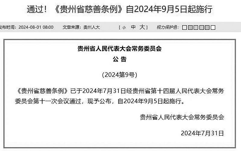 ■ 本报记者 皮磊 7月31日,《贵州省 条例》经贵州省第十四届人民代表大会常务委员会第十一次会议通过,自2024年9月5日起施行。条例共35条,其中明确,自然人、法人和非法人组织在贵州省行政区域内开展 活动以及与 有关的活动,适用本条例。 该条例明确了 事业的定位,并规定了政府相关部门各自职责。其中第四条规定,县级以上人民政府应当将 事业纳入国民经济和社会发展规划,建立健全 工作协调机制,统筹解决 工作中的重大问题,支持 事业发展。 第五条规定,县级以上人民政府民政部门主管本行政区域内的 工作;其他有关部门在各自职责范围内做好 相关工作,加强对 活动的监督、管理和服务; 组织有业务主管单位的,业务主管单位应当对其进行指导、监督。乡镇人民政府、街道办事处应当协助民政部门和其他有关部门做好本辖区内的 相关工作。村民委员会、居民委员会在有关政府职能部门的指导下,依法参与 工作。 为加强 文化宣传,该条例提出,每年9月5日“中华 日”所在周为“贵州 周”,集中开展 活动和文化宣传等。省设立“贵州 奖”;市州、县级人民政府根据国家和省有关规定对在 事业发展中做出突出贡献的自然人、法人和非法人组织予以表彰。 条例明确,县级以上人民政府及其有关部门和单位可采取下列措施,引导、支持 事业发展: 一、依法落实对 组织、捐赠人、受益人的税费优惠政策,为 组织、捐赠人等办理涉税事项提供服务便利; 二、依法通过购买服务等方式,支持符合条件的 组织向社会提供服务; 三、鼓励和支持通过孵化培育、人员培训、公益创投、项目指导等方式,为 组织提供资金支持和能力建设服务; 四、鼓励 组织依法兴办非营利性的医疗、教育、养老、托幼、助残、应急救援、生态环境保护、心理健康等方面的社会服务机构,其所兴办的学校教学和学生生活、养老服务机构、托育机构、残疾人托养服务机构用电、用水、城镇集中供热享受居民价格政策,用气价格按照国家和省的有关规定执行; 五、鼓励和支持有意愿有能力的自然人、法人和非法人组织通过设立基金会、 信托等积极参与 事业; 六、法律、法规规定的其他措施。 记者注意到,该条例对 组织开展公开募捐活动、个人网络求助等内容也作出了具体规定。条例第十九条明确,个人因疾病、自然灾害、意外事件或者其他原因导致家庭经济困难向社会发布求助信息的,求助人、信息发布人应当对求助信息的真实性负责,不得以虚构事实、夸大困难等方式欺骗、诱导他人捐赠。个人求助信息应当在国务院民政部门指定的网络服务平台发布。 此外,条例对发展 事业也提出了一系列具体的鼓励措施。如第二十七条规定,开展 、设立 信托的,依法免征实物、有价证券、股权等权利转让的行政事业性收费。促进 数据跨地区、跨部门共享和互信互认,优化捐赠人税前扣除流程。 第三十一条明确,鼓励和支持金融、审计、评估、鉴定、公证、法律服务等机构,为捐赠人、 组织、 信托等提供专业服务,并按照规定减免相关服务费用。 |