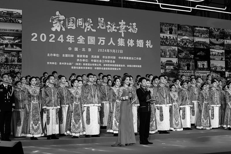9月22日,由全国妇联、国家民委、民政部、农业农村部、中央军委政治工作部联合主办,中国社会工作联合会承办的“家国同庆 见证幸福”2024年全国万人集体婚礼,在北京主会场、各省(自治区、直辖市)和新疆生产建设兵团49个分会场同步进行。来自全国各省区市和港澳台地区的5105对新人参与这场中式集体婚礼,在同一时刻许下幸福誓言,喜迎新中国75周年华诞。全国妇联党组书记、副主席、书记处第一书记黄晓薇为新人证婚。民政部党组书记、部长陆治原为新人主婚。 仪式上,通过视频连线,主分会场的万名新人完成婚礼仪式,共同许下风雨同行、相知相守、家风润心、向上向善、修身立业、胸怀家国的幸福誓言。全国道德模范、全国文明家庭等先进典型代表和金婚伉俪代表等为新人们送上美好祝福。新人代表发出了争做中华家庭美德的传承者、新型婚育文化的引领者、社会主义家庭文明新风尚的践行者倡议。 各会场精彩纷呈,广东广州设置婚俗文化展,把代表广府婚俗历史文化变迁的喜文化纳入展陈,展示婚俗礼仪;福建福州邀请6对台胞新人参加,成为深化两岸情感融合的有力印证;重庆将婚礼向婚恋延展,现场邀请未婚青年观礼;陕西西安新人们身着唐制婚服,穿过六国元首共植的友谊树,在中国-中亚峰会的主会场许下相守誓言……各地纷纷将优秀传统文化、移风易俗等家庭文明建设内容融入集体婚礼环节,以中式婚礼弘扬婚事新办简办新风貌。 新人们来自28个民族,遍及科技、教育、文化、医疗、农业等各行各业。在各分会场,妇联组织联合有关部门将传统文化、移风易俗等家庭文明建设内容融入集体婚礼相关环节,传承民族婚俗礼仪文化,弘扬婚事新办的文明新风。 民政部相关负责人表示,以“家国同庆 见证幸福”为主题举办集体婚礼,是对祖国最深情的告白,更是厚植家国情怀的生动体现。这场万人集体婚礼将在倡导移风易俗、婚事新办简办,反对高额彩礼、大操大办,进一步倡导新型婚育文化,培育社会主义家庭文明新风尚等方面起到积极作用。 (据中国社会工作联合会) |