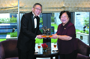 香港马会会员及物业事务执行总监陈锦程(左)向彭佩云